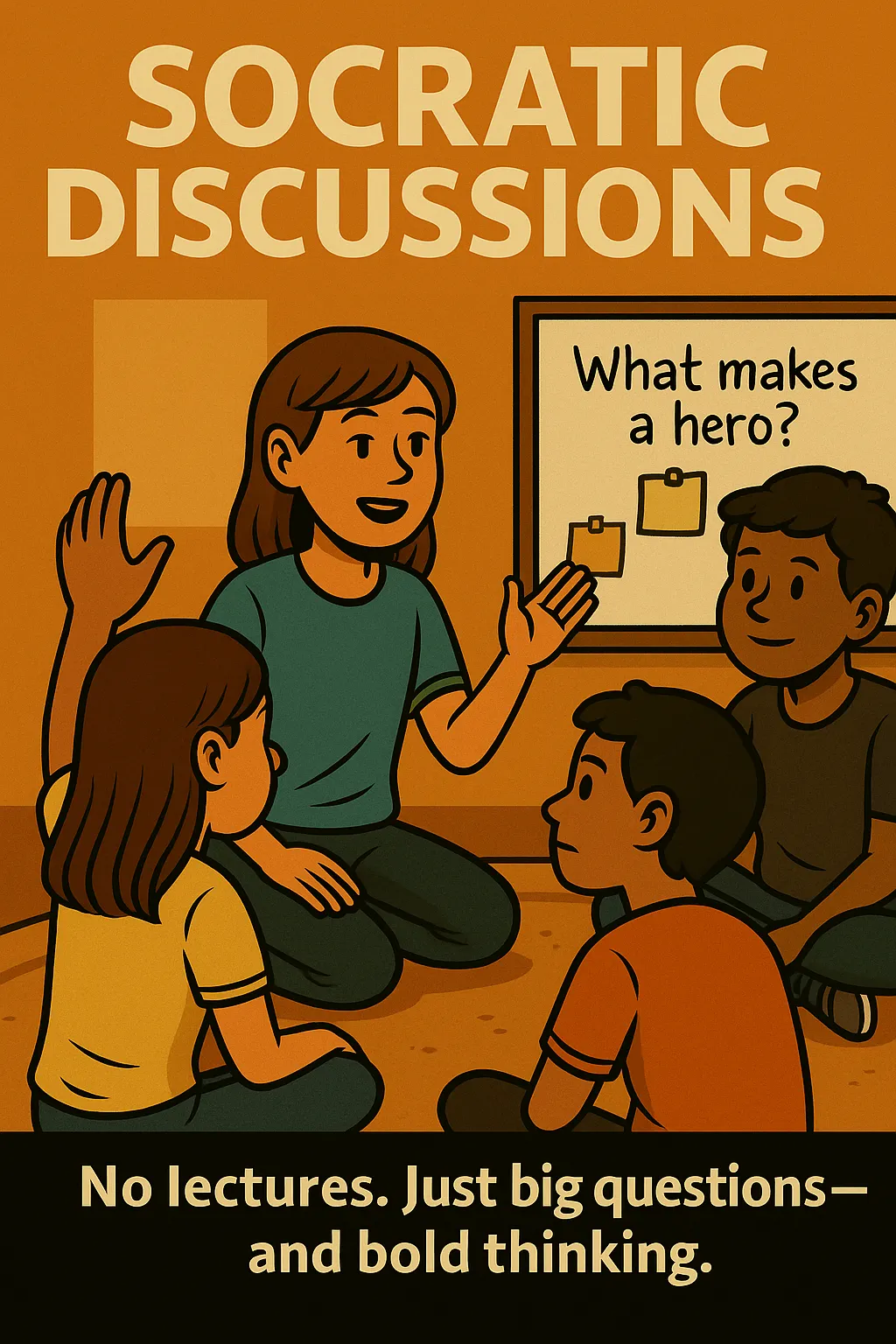 Deep Socratic discussions about heroes, history and self governance to hone critical thinking skills and the ability to powerfully think, write and speak.